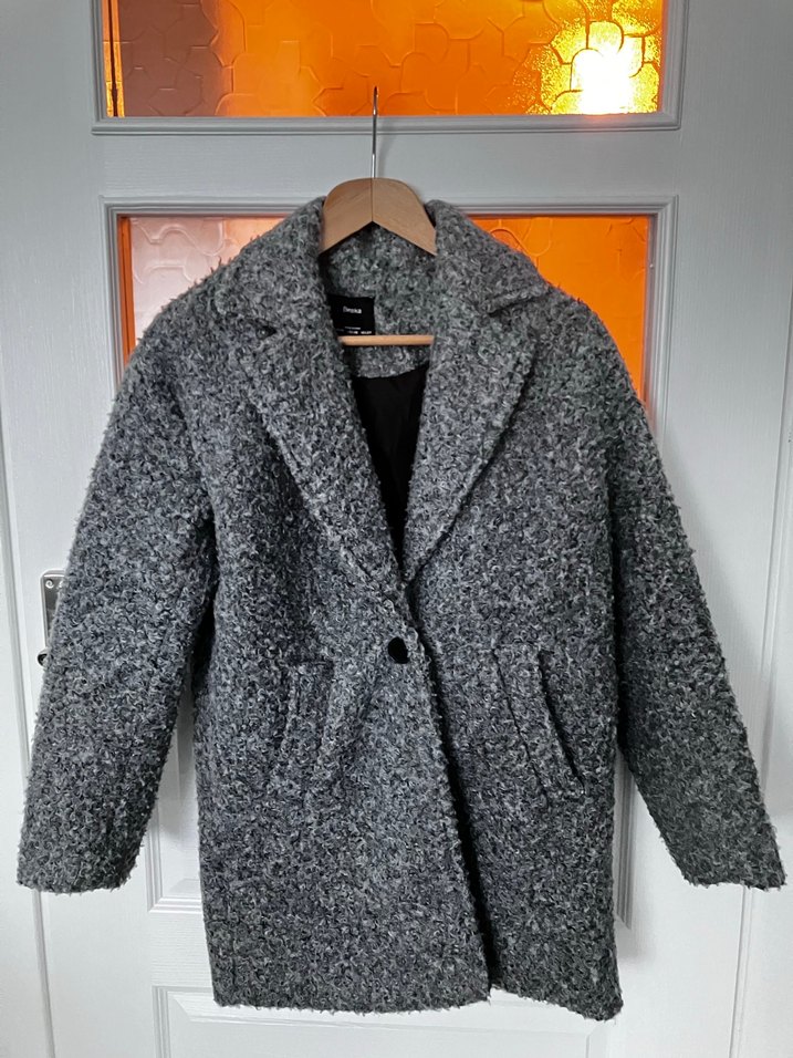 Gri renkte, kıvırcık dokulu kumaştan yapılmış, iki düğmeli ve iki cepli kaban.