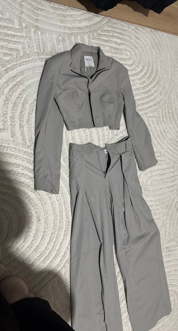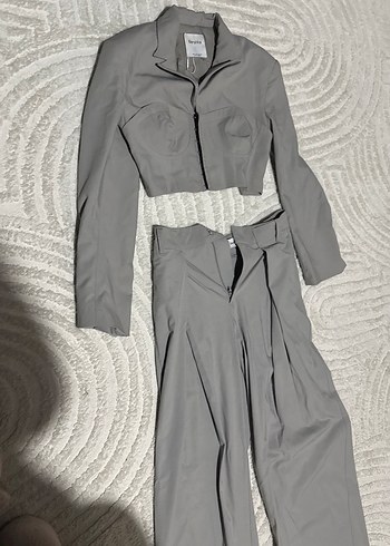 Bershka Gri Piliseli Kadın Pantolon Ceket Takım