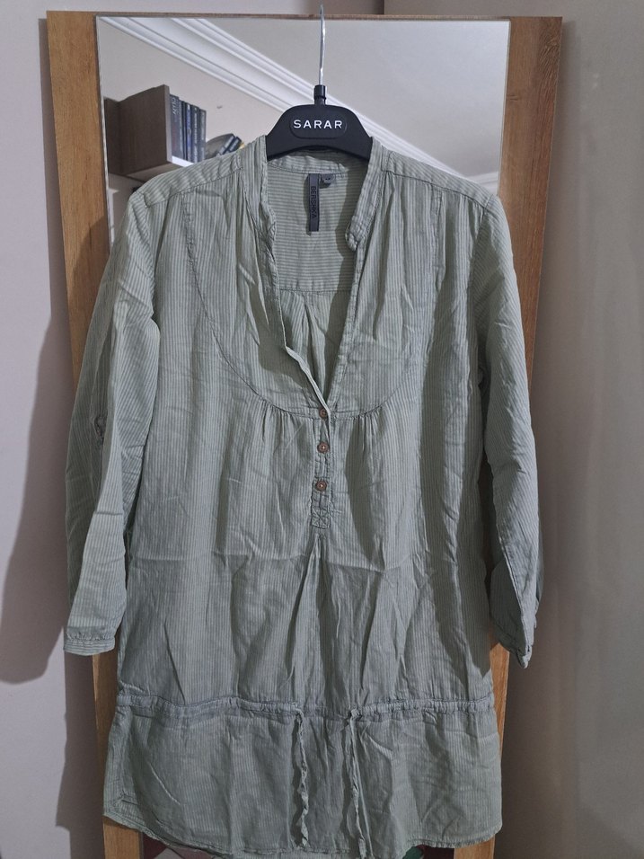 Bershka marka, gri baskılı, V yaka ve düğmeli uzun kollu kadın gömleği. Yumuşak keten kumaştan, rahat kesim ve günlük kullanım için uygun.