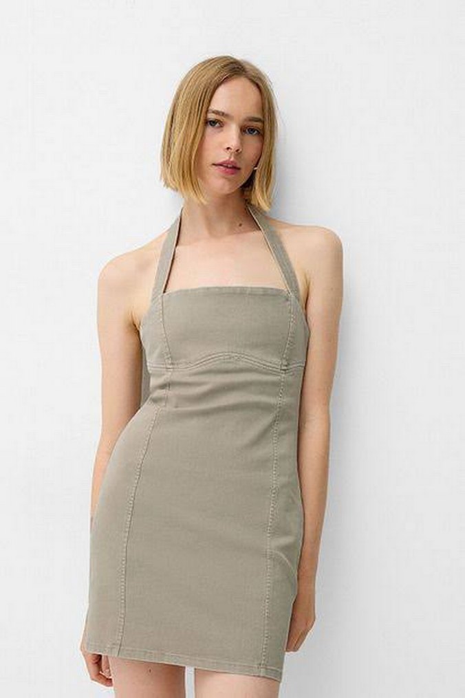 Bershka haki boyundan askılı mini denim Elbise