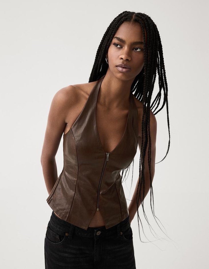 Bershka Halter Yaka Suni Deri Fermuarlı Top