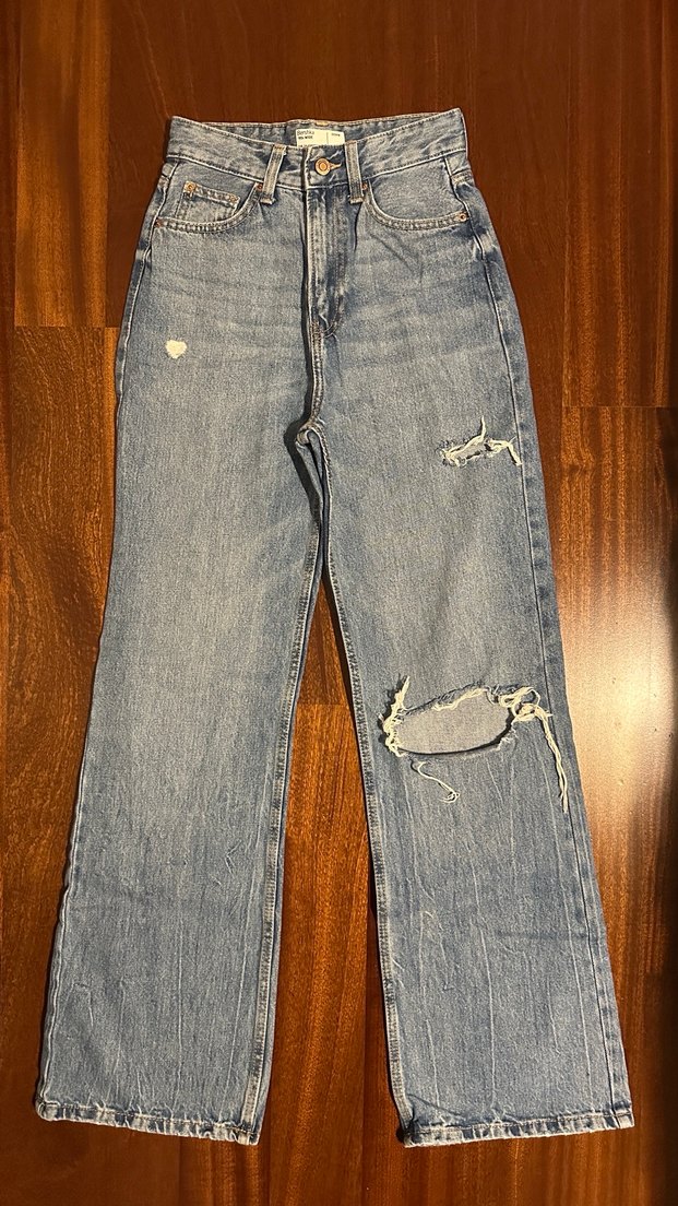 90’lar serisi, geniş paça, yüksek bel, kadın jean. Sol dizde yırtık detayı bulunur.