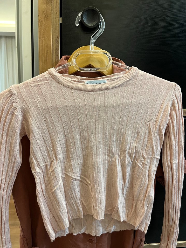 Toz pembe renkli, uzun kollu, fit kesim ve triko örme yapıda pamuklu kumaştan kadın bluz. Günlük kullanıma uygun rahat ve şık bir parça.