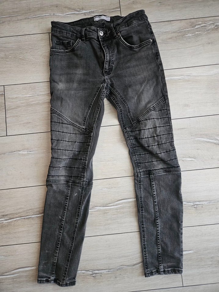 Gri renkte, biker tarzı, kemerli ve midi boyda dar kesim erkek jean pantolon, günlük kullanıma uygundur.