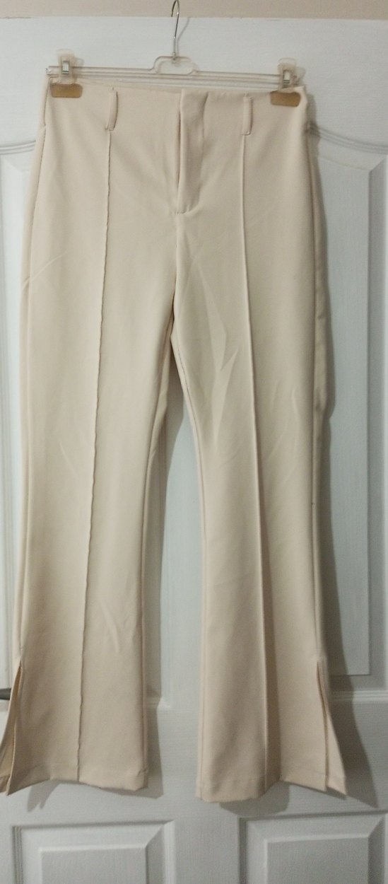 Bej renkli, midi boy, regular fit ve pilili kumaş pantolon. Düz ve yumuşak sentetik kumaştan, ofis için minimal ve normcore tarzda uygun. ürünün paça kısımları yırtmaçlı 38 beden ölçüleri resimlerde vardır koyu koyu Krem rengi yenidir sorunu yokdur