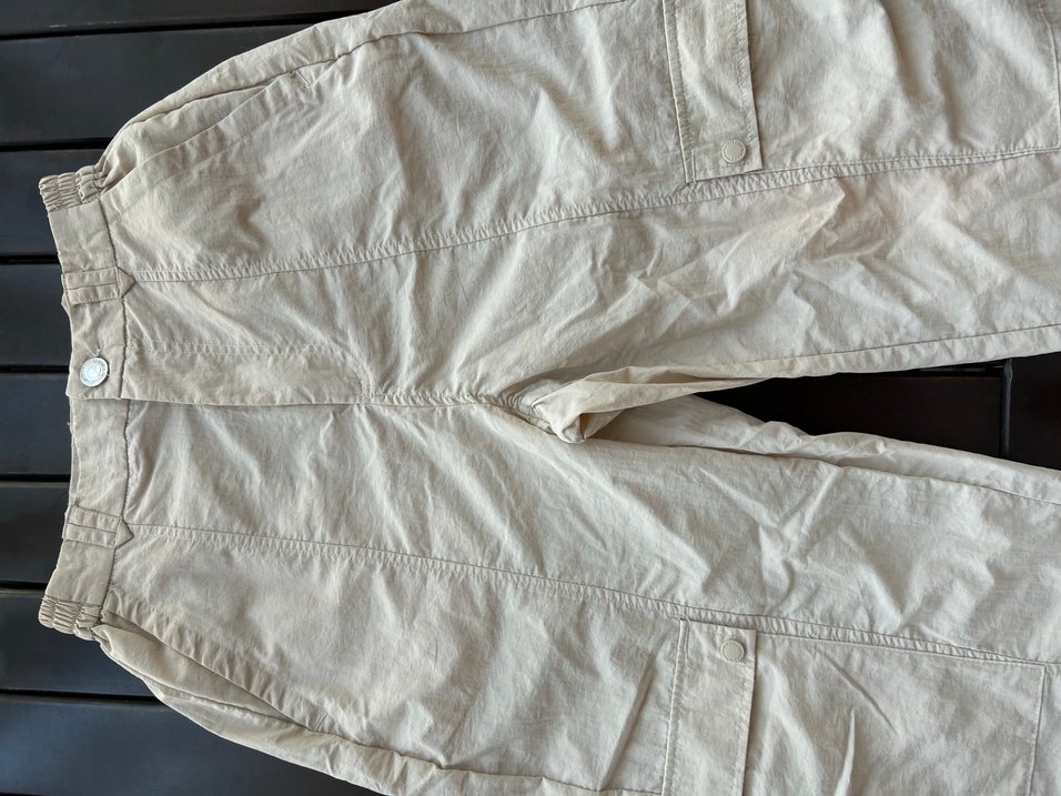 Yazlık veya baharlık paraşüt kumaş kargo pantolon. Ekru renktedir. 34-36 bedene uygundur. 1.60 boy veya altına tam olacaktır. Hiç bir defosu yoktur.