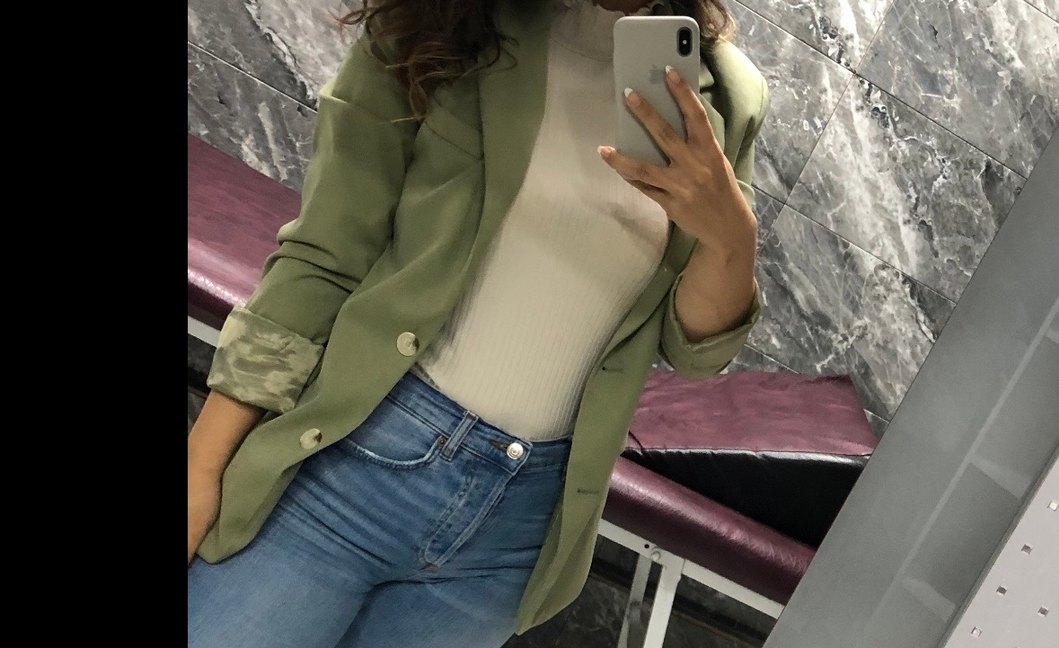 Düğmeli, uzun kollu, yaka detaylı çağla yeşili renk kadın blazer temizdir deformesi yok sayılı giyildi