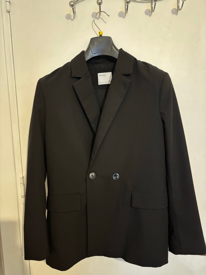 Siyah kadın blazer ceket, düğmeli ön, uzun kollu ve normal boyda. Sentetik kumaştan, iş ve sokak stiline uygun. Biraz da oversize duruyor. Fazladan düğmesi ile gönderilecektir.