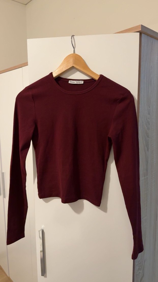 Bordo renk, süet kumaştan yapılmış, uzun kollu ve bisiklet yaka, vücuda oturan kadın kazak. Minimalist ve basic tarzda, günlük kullanıma uygun.