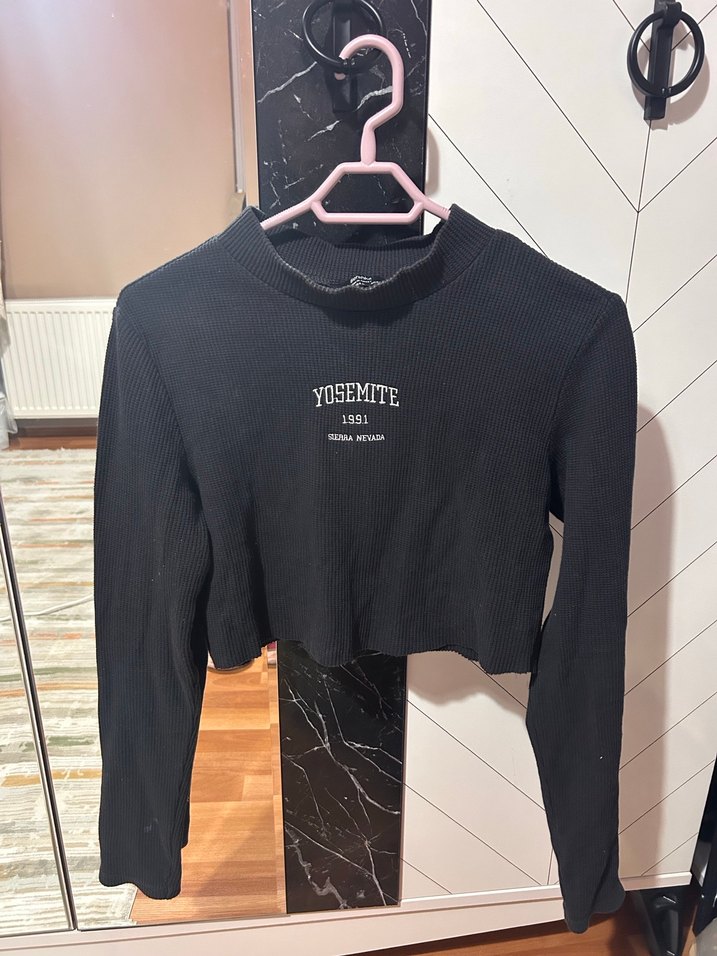 Uzun kollu, fitted kesim gri crop top, önünde 'YOSEMITE 1991' baskısı bulunur. Yumuşak sentetik kumaştan, trend ve spor şıklığı sağlar. Takım şeklinde vericem üst L alt M beden