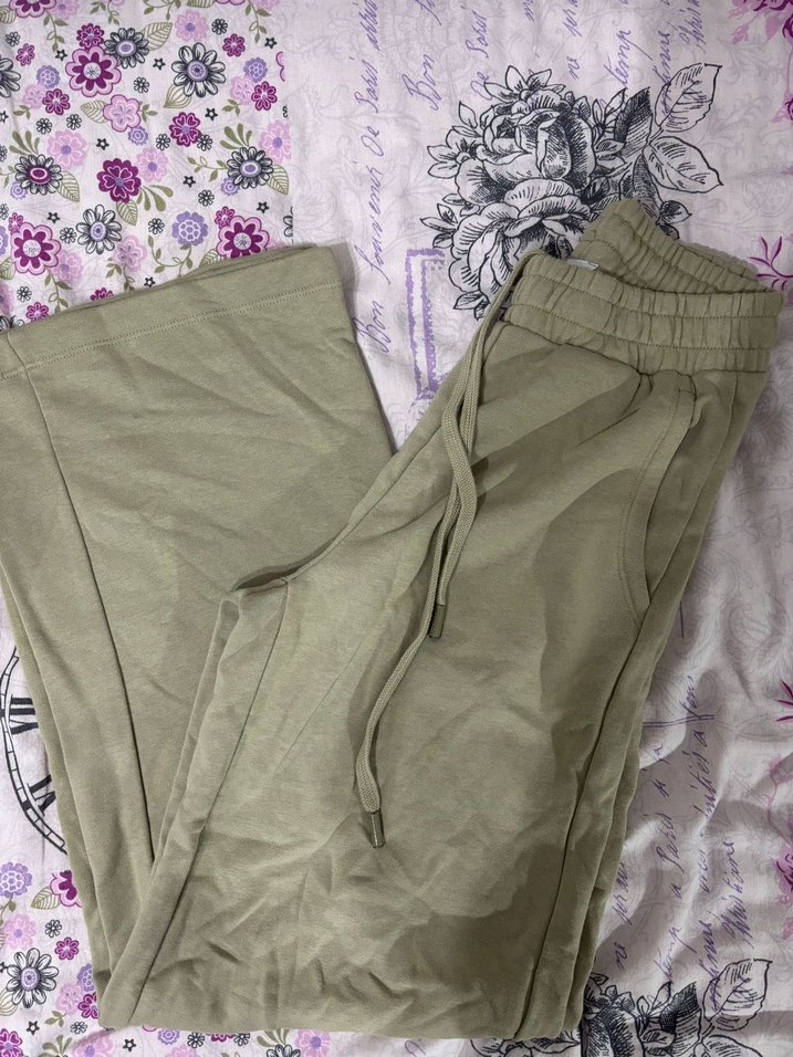 Haki renkte, rahat kesim midi uzunluğunda, sentetik kumaştan yapılmış kadın eşofman altı.Günlük kullanıma uygun, sokak stiline uygun ve zahmetsiz şıklık sunar.