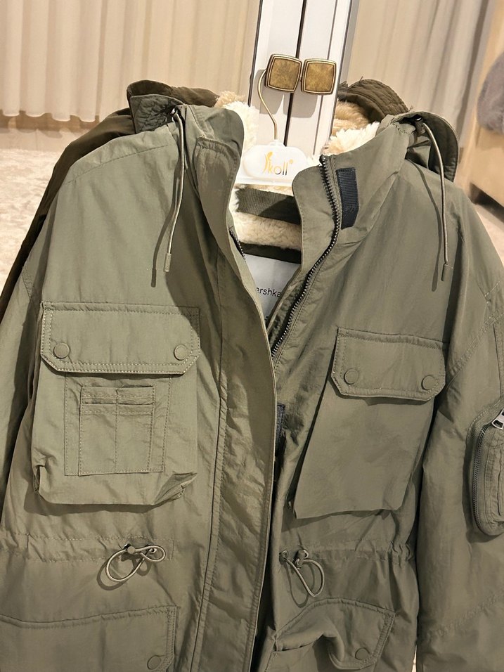 Bershka kolsuz mont, suni kürk detaylı ve bol kesimdir. Bej-gri renkli, baskılı, notched lapel yakalıdır, dış mekan için uygundur. Bir defa tek giyildi