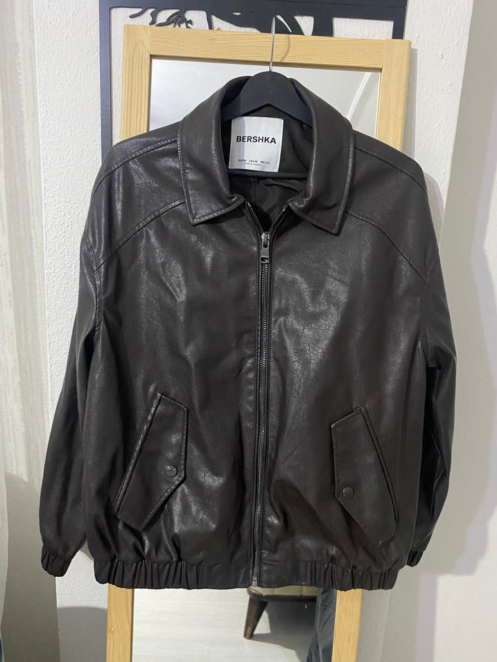 BERSHKA markalı kahverengi deri ceket, uzun kollu ve notlu yakalıdır. Bol kesimi ve fermuarlı kapanışı günlük kullanıma uygundur.