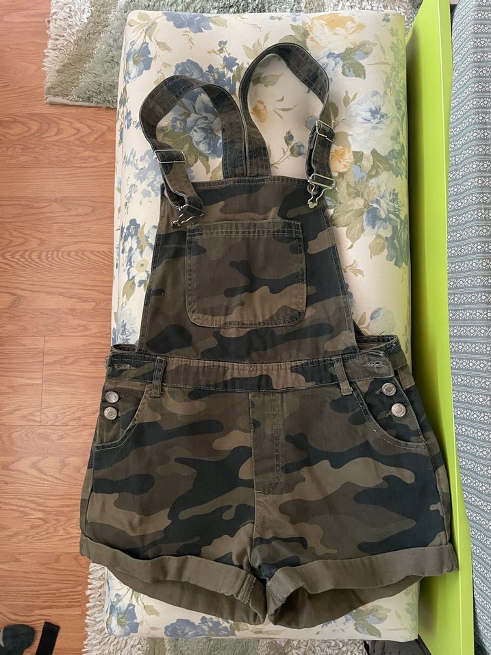 Kemer tokalı, askılı ve kolsuz, straplez yaka kamuflaj desenli, bol kesim kısa tulum. Sentetik kumaştan, dış mekan kullanımı için uygun.