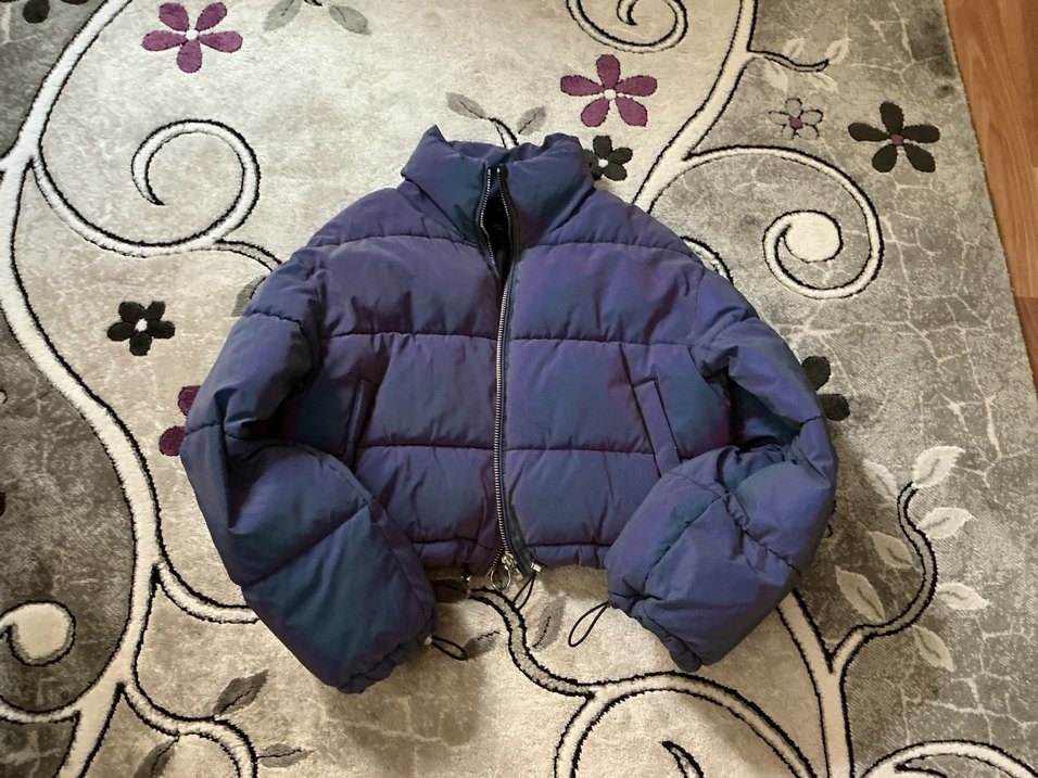 Mor renkte, fermuarlı ve yüksek yakalı kadın kışlık mont. Yumuşak kumaştan, kısa boyda ve uzun kollu, rahat ve şık bir sokak giyimi tarzı sunar.