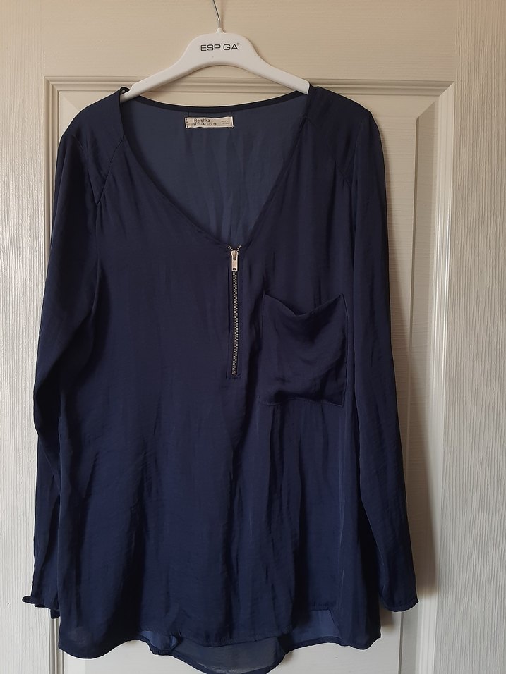 Bershka marka, V yakalı, uzun kollu, ön fermuarlı, ipeksi dokulu, normal midi boyda, bol kesim lacivert Bluz . Günlük kullanıma uygun sade Normcore Paris tarzı.