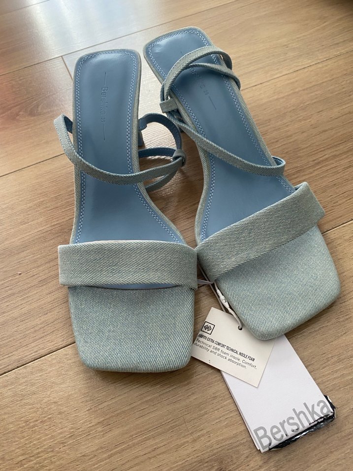 Bershka markalı, mavi denimden yapılmış, tokalı kayışlı ve ince topuklu, yeni ve etiketli, 39 num