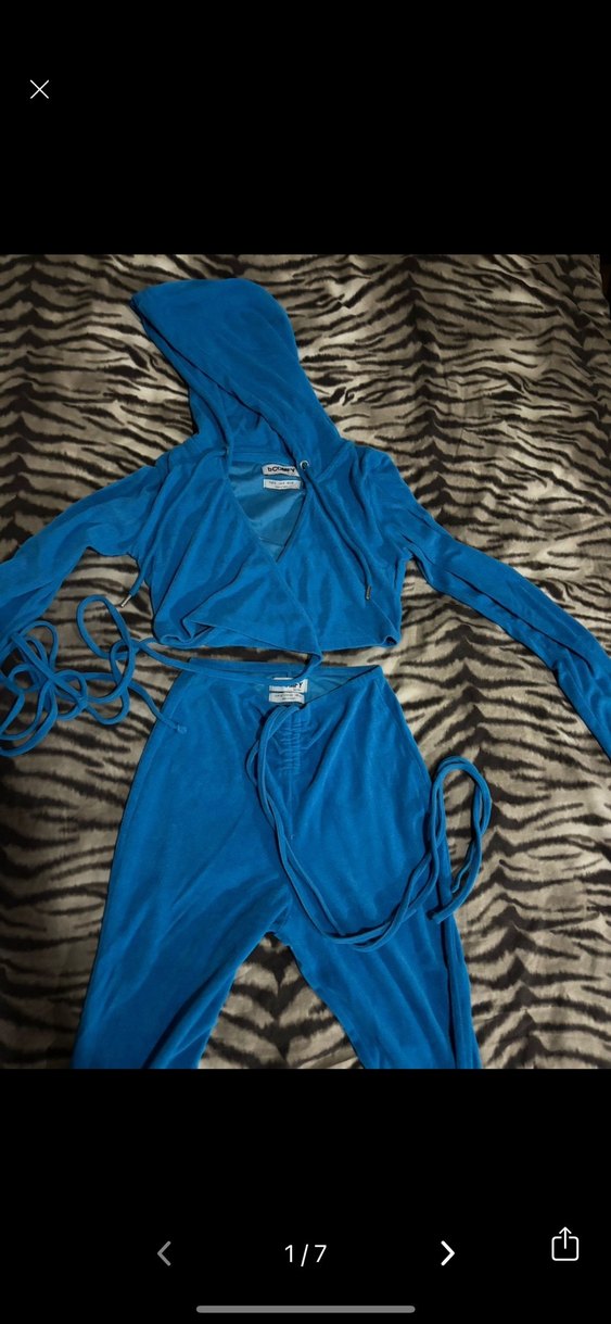 Koyu mavi renkte, kapüşonlu ve uzun kollu, vücuda oturan kadın eşofman takımı. Yumuşak ve sıcak kumaştan, sokak modası ve athleisure stilini yansıtır. Üstü kısa kesim, altı bağcıklı pantolon.