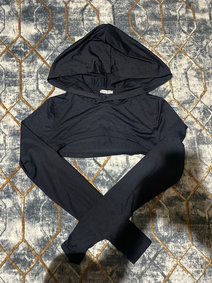 Kadınlar için siyah, uzun kollu kapüşonlu, dar kesim crop top. Pürüzsüz sentetik kumaştan, rahat ve şık görünüme sahip.
