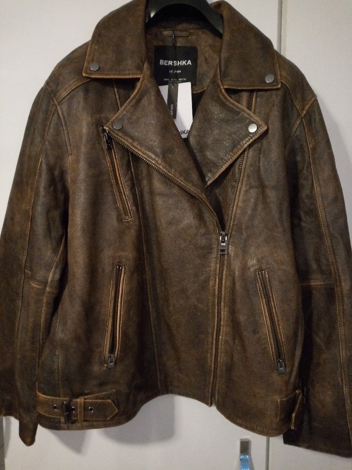 BERSHKA markalı, %100 Gerçek Deri.Kahverengi deri biker ceket, L beden Large. Notlu yaka, tokalı detaylar ve bol kesim ile grunge punk tarzında. Askılı kollu ve midi uzunlukta.