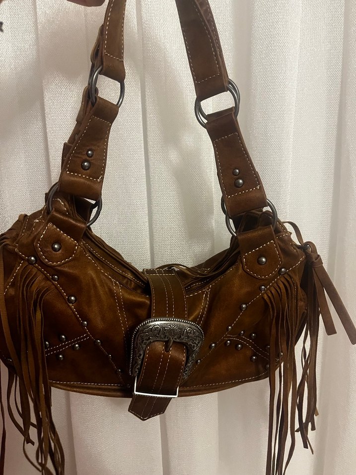 Koyu kahverengi deri, işlemeli detaylı ve tokalı kadın çantası, püsküllü bohem biker tarzında. Günlük kullanıma uygun. mağazadan yeni alınmış gibi hiç kullanmadım evde duruyor sadece.