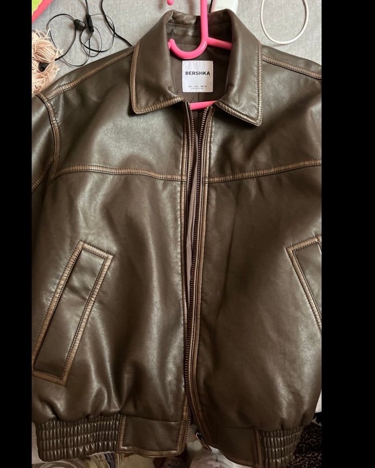 Bershka markasına ait, parlak kahverengi deri, fermuarlı, kesik yaka ve uzun kollu, normal uzunlukta kadın ceket.