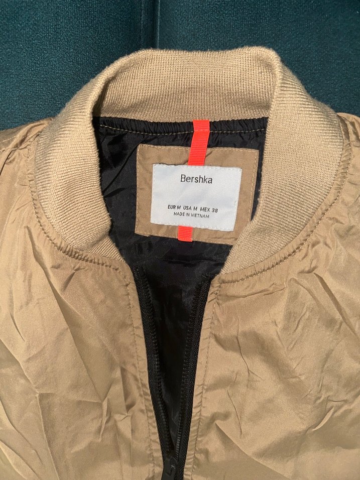 Bershka markalı, fermuarlı, bisiklet yaka, kahverengi bomber ceket. Sentetik kumaştan olup günlük sokak stiline uygundur.