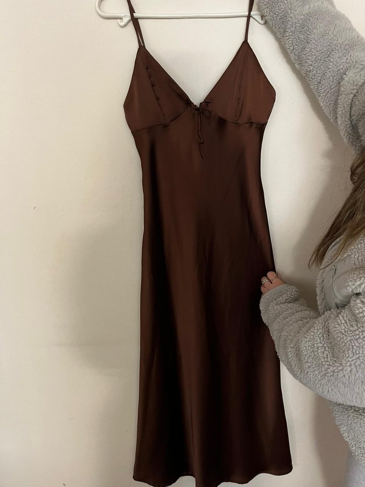 bershka kahverengi saten askılı dökümlü elbise