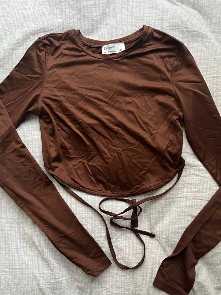 Bershka markasına ait kahverengi sırtı bağlamalı üst hiç giyilmedi kollar normal kalıp bedeni dar kalıp