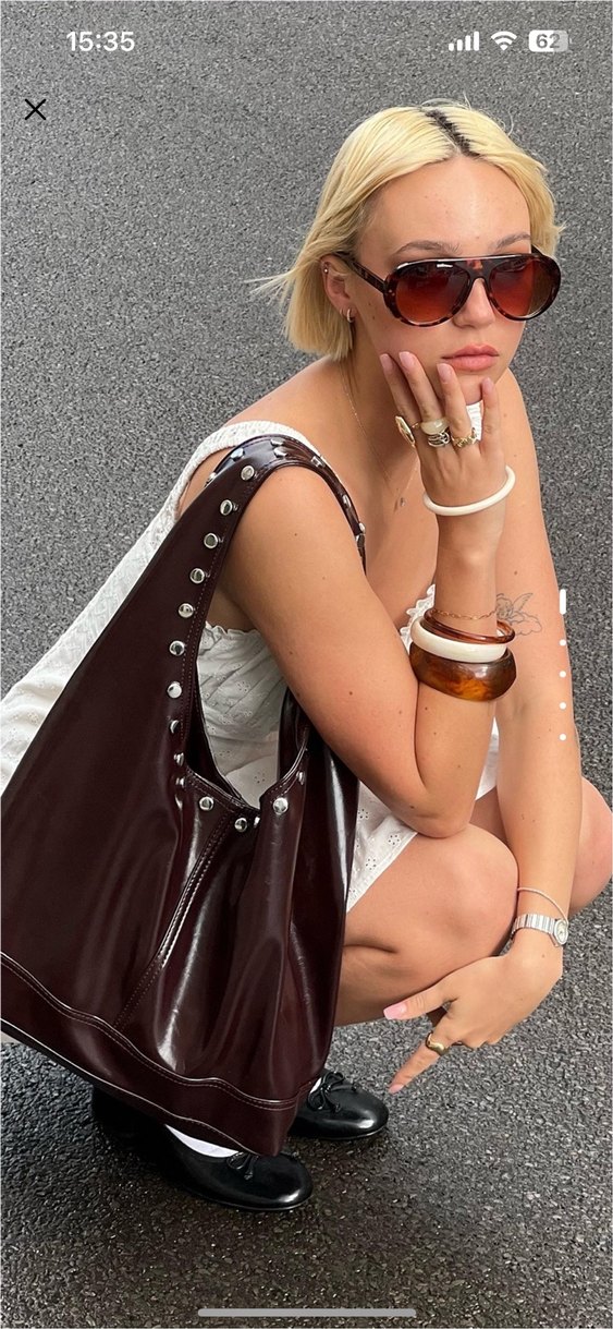 Parlak kahverengi deri tokalı kadın çanta, sokak stili ve günlük kullanım için uygundur. Düz yüzeyi bohem ve retro tarzları tamamlar.