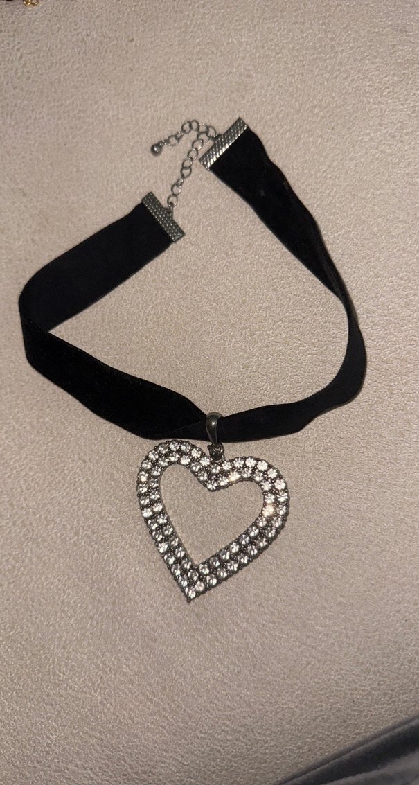 Siyah, parlak payetli kalp detaylı gotik stil midi uzunlukta nakışlı kolye, romantik akşamlar için uygun.