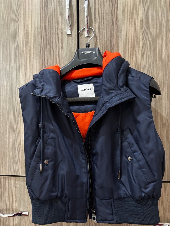 Bershka markasına ait, kapüşonlu, kemerli ve kısa kesim, fitted model kadın yelek. Dış kısmı mavi, iç kısmı turuncu renkli, baskılı desenlidir. Outdoor kullanım için uygun.