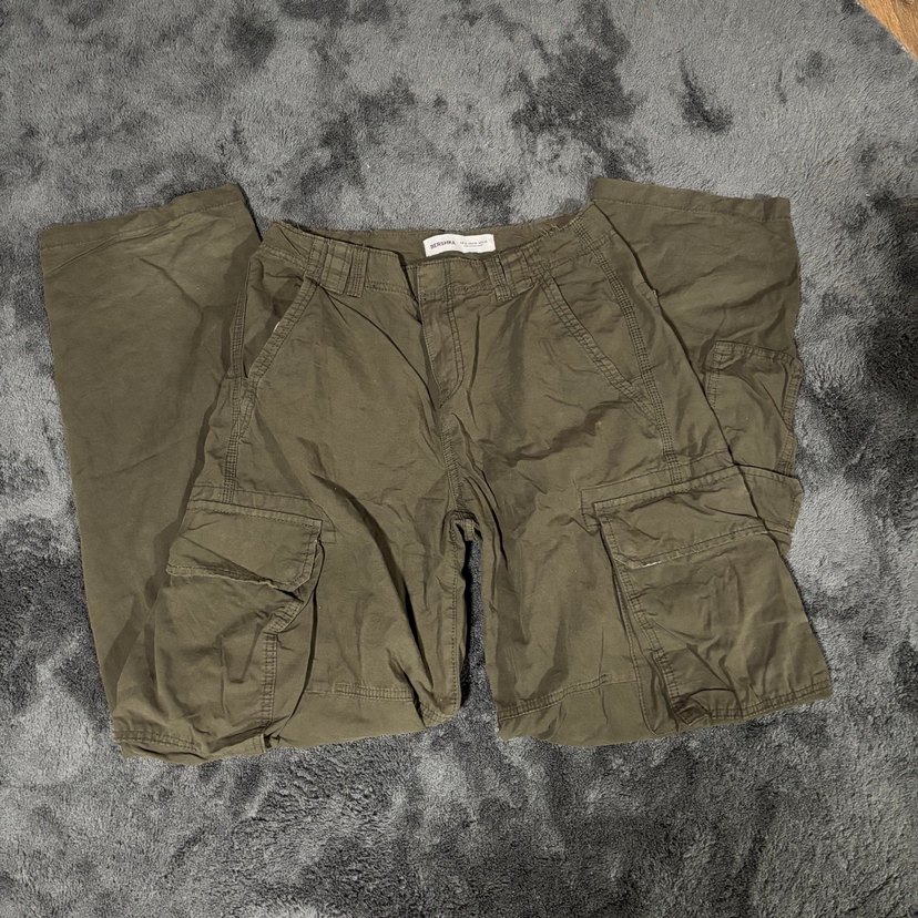 Bol kesim cep detaylı haki yeşil renginde bir kargo pantolondur m bedendir markası bershka
