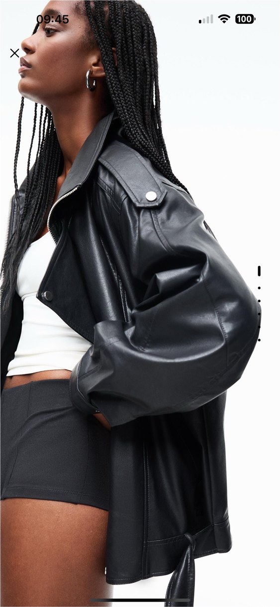 Siyah deri ceket, kemerli ve kesik yakalıdır. Strappy kollu, midi boy ve regular fit ile sokak stiline uygundur.
