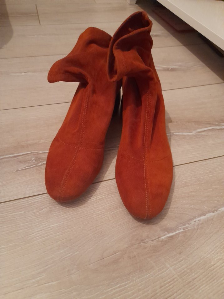bershka kiremit süet kadın botlar, 6 cm topuk boyu . Bohem tarzıyla günlük kullanıma uygun, rahat ve şık görünüyor.
