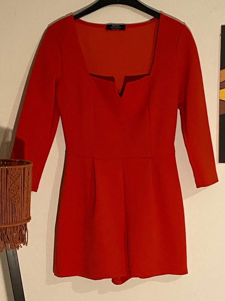 Kırmızı kumaştan, V yakalı göğüs detaylı, uzun kollu, modern klasik tarzda mini tulum. Üstten giyiliyor. En sonda fotoğrafım mevcut.