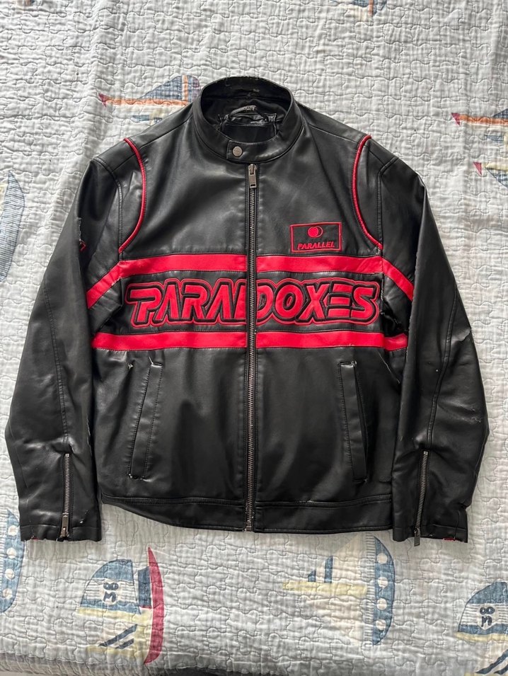 Koyu kırmızı baskılı, siyah deri biker ceket. Dar kesim, bisiklet yaka ve fermuarlı ön kapama içerir. Uzun kollu, midi boyda ve grunge punk tarzında.