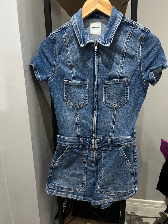 BERSHKA Kısa Kollu Kot Mini Tulum