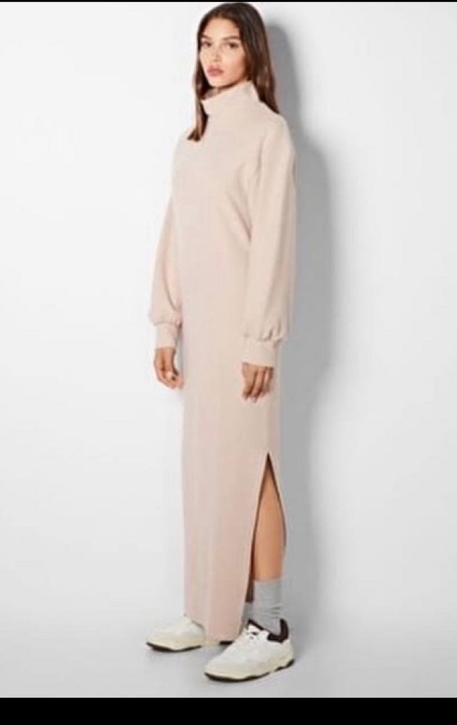 Bej renkte, uzun balıkçı yaka ve uzun kollu, yumuşak ve sıcak kumaştan yapılmış bershka elbisesi. Rahat kesimi ve yan yırtmaçlarıyla günlük kullanıma uygundur. Yeni etiketli,aldım ama doğumdan sonra olmuyor. Sadece denendi,ölçüleri fotoğrafta var, xs beden
