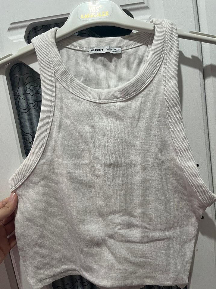 Yumuşak sentetik kumaştan, kolsuz, yakası yuvarlak ve vücuda oturan beyaz crop top. Rahat sokak stili için uygun.