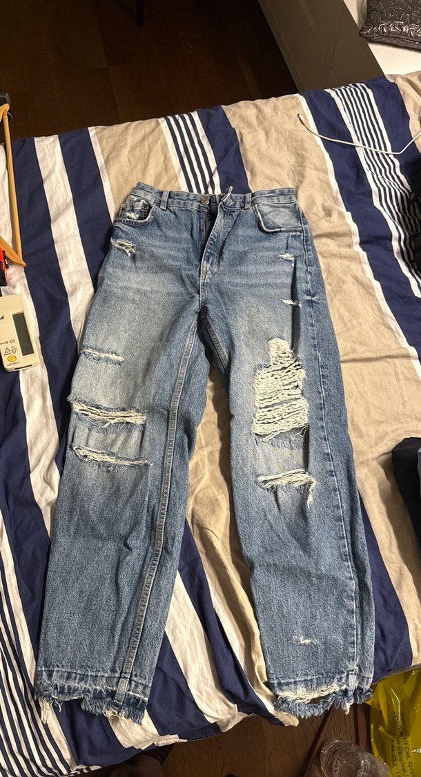 mavi renkte, yırtık detaylı ve kemerli bel tasarımlı, bol kesim kadın kot pantolon, günlük rahat kullanıma uygun.