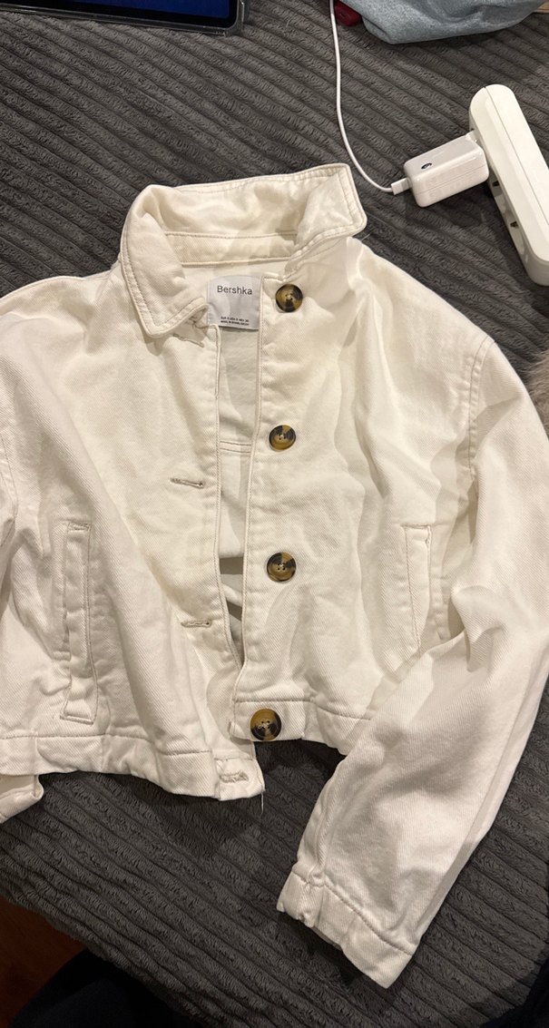 Beyaz düğmeli, bol kesim uzun kollu keten denim ceket. Çentikli yaka ve günlük sokak stili için uygun.