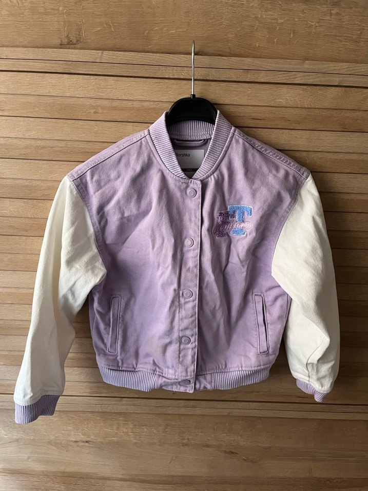 Mor düğmeli ceket, uzun kollu ve bol kesimdir. Pastel tonlar ve baskılı detaylarla trend bir günlük stil sunar. Bisiklet yaka ve normal boyda, rahat bir athleisure görünümü sağlar.