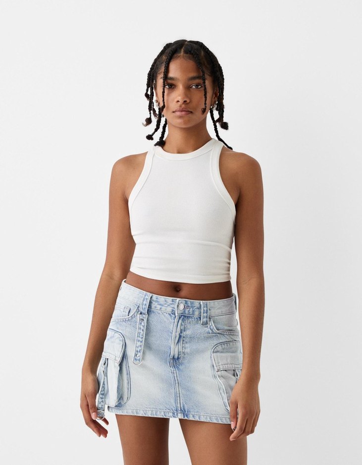 Bershka mini etek, rahat ve şık bir görünüme sahip, vücuda oturan kesimiyle günlük kullanıma uygundur. Normal boyda ve açık renk tonundadır.