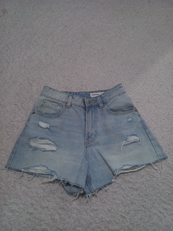 Mavi denim mini şort, yıpranmış detaylarla gündelik sokak stiline uygun.