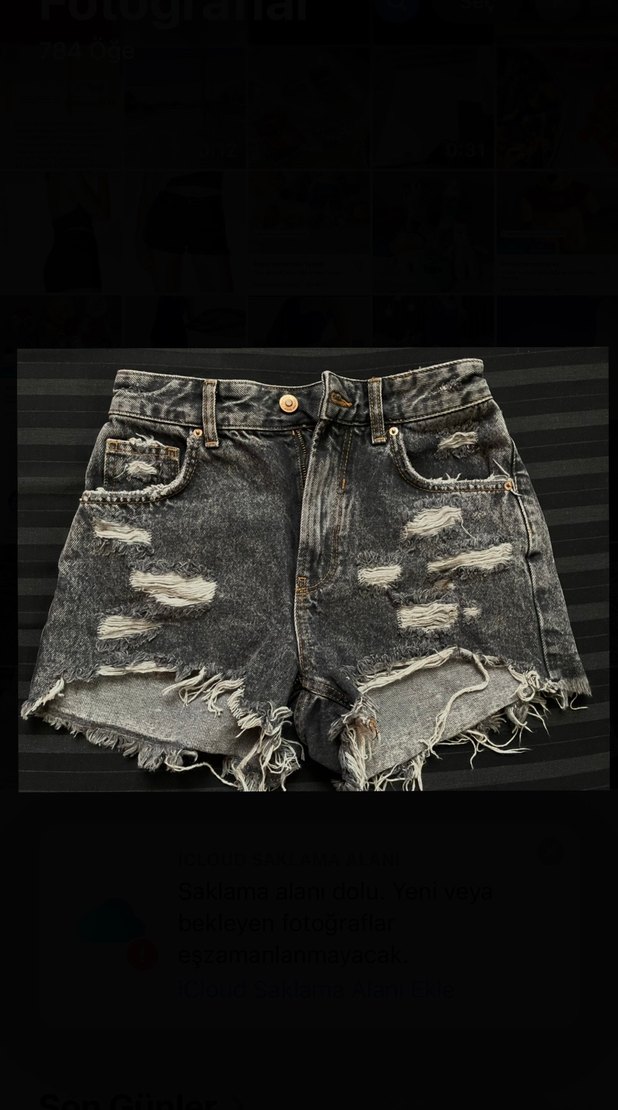 Gri kot şort, bol kesim ve yırtık detaylarla dikkat çeker. Bikez giyildi yeniden farksız #plajgiyim #bershkaşort #bershka