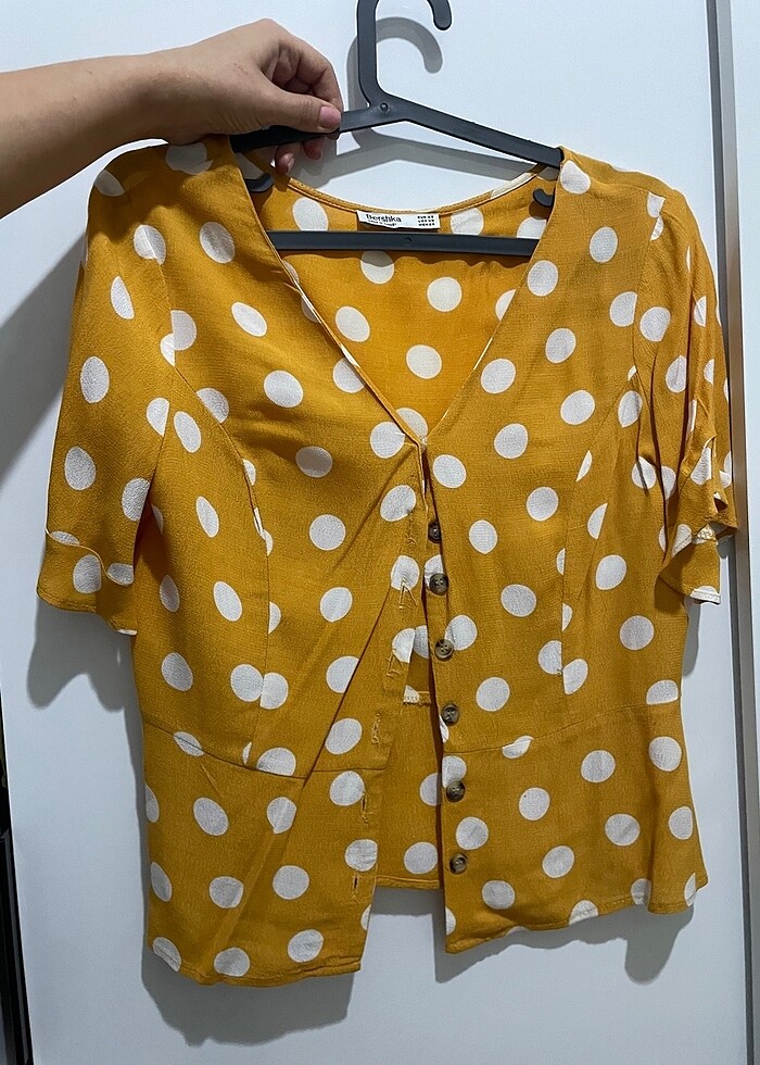 Bershka koyu sarı puantiyeli belden oturtmalı gömlek bluz