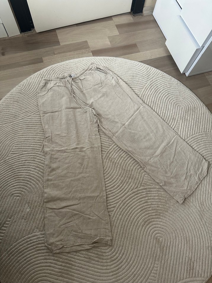 Krem rengi, bol paça pantolon. Defo yoktur hafif ic gosteriyor.