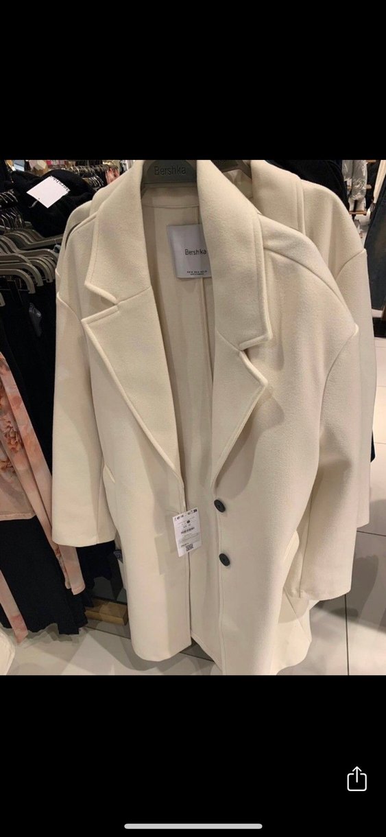 Bershka markasına ait krem renginde, yumuşak dokulu, geniş yakalı ve iki düğmeli kaban. Şık ve sade tasarım sunar.