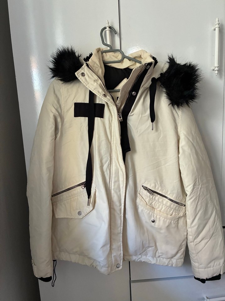 Beyaz, kürk detaylı kapüşonlu, notalı yaka ve fermuarlı cepleri olan, yumuşak ve sıcak kumaştan yapılmış dar kesim kışlık ceket.